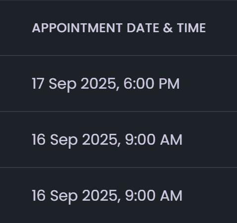 - Appointment Date and Time (scheduled slot).