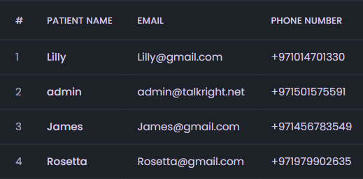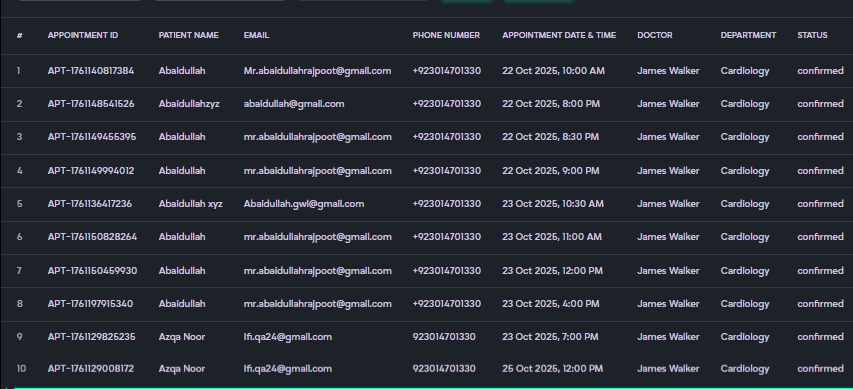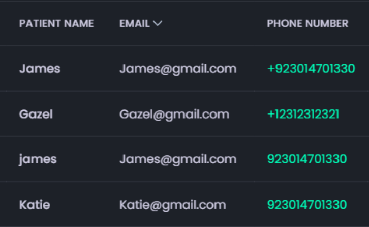 - Patient Name, Email, and Contact Number (e.g., Jack Smith, jack@gmail.com, +92 99939393).