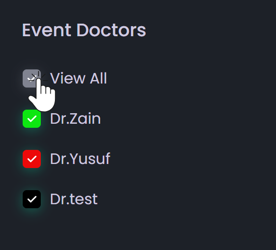 - Select Checkboxes having doctors' list beside calendar to view specific appointments, or choose View All to display all appointments on the calendar.
