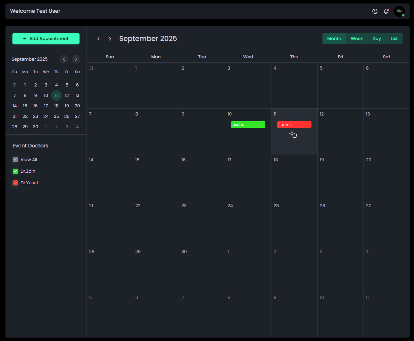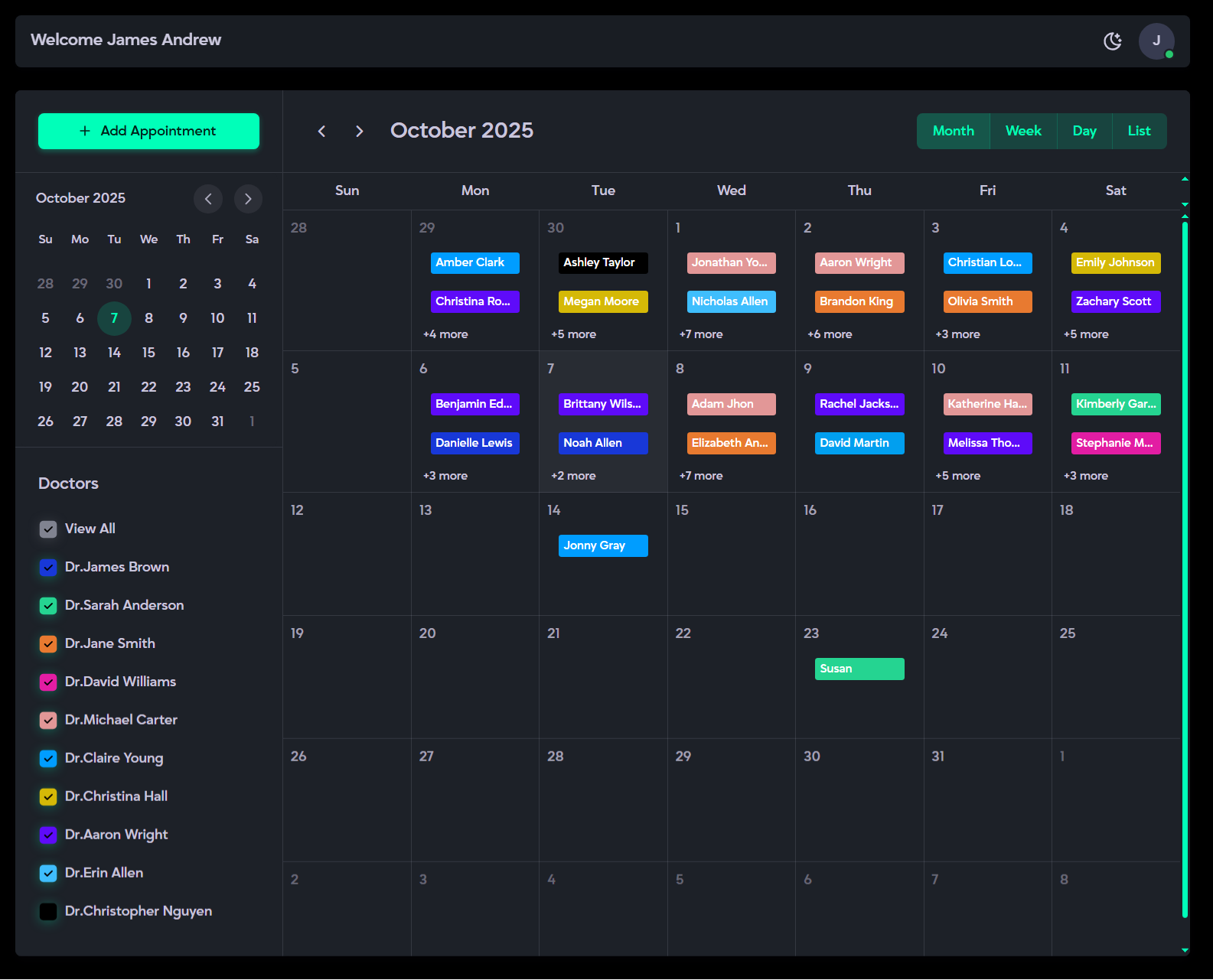 - Doctor Filtering: Checkboxes beside the calendar let you filter and view specific doctor's appointments, or use the View All option to display all appointments in the calendar.