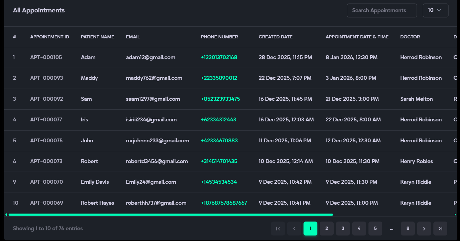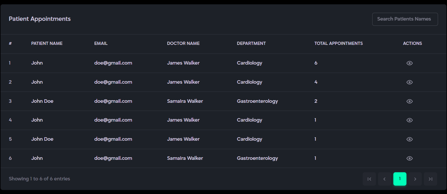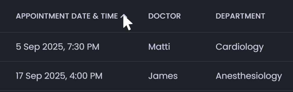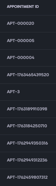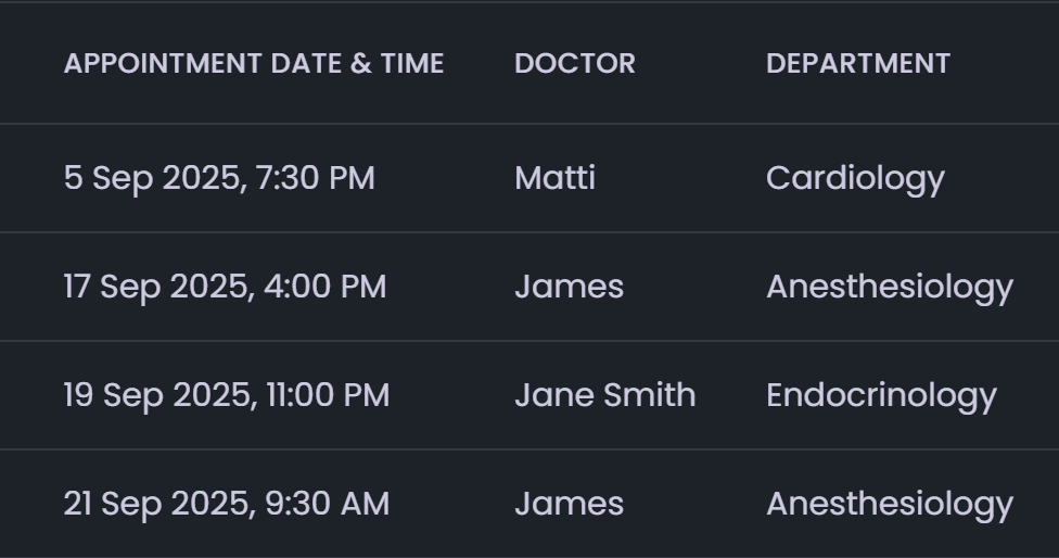 - Appointment: Displays all booked appointments with filtering and sorting options for easy management.