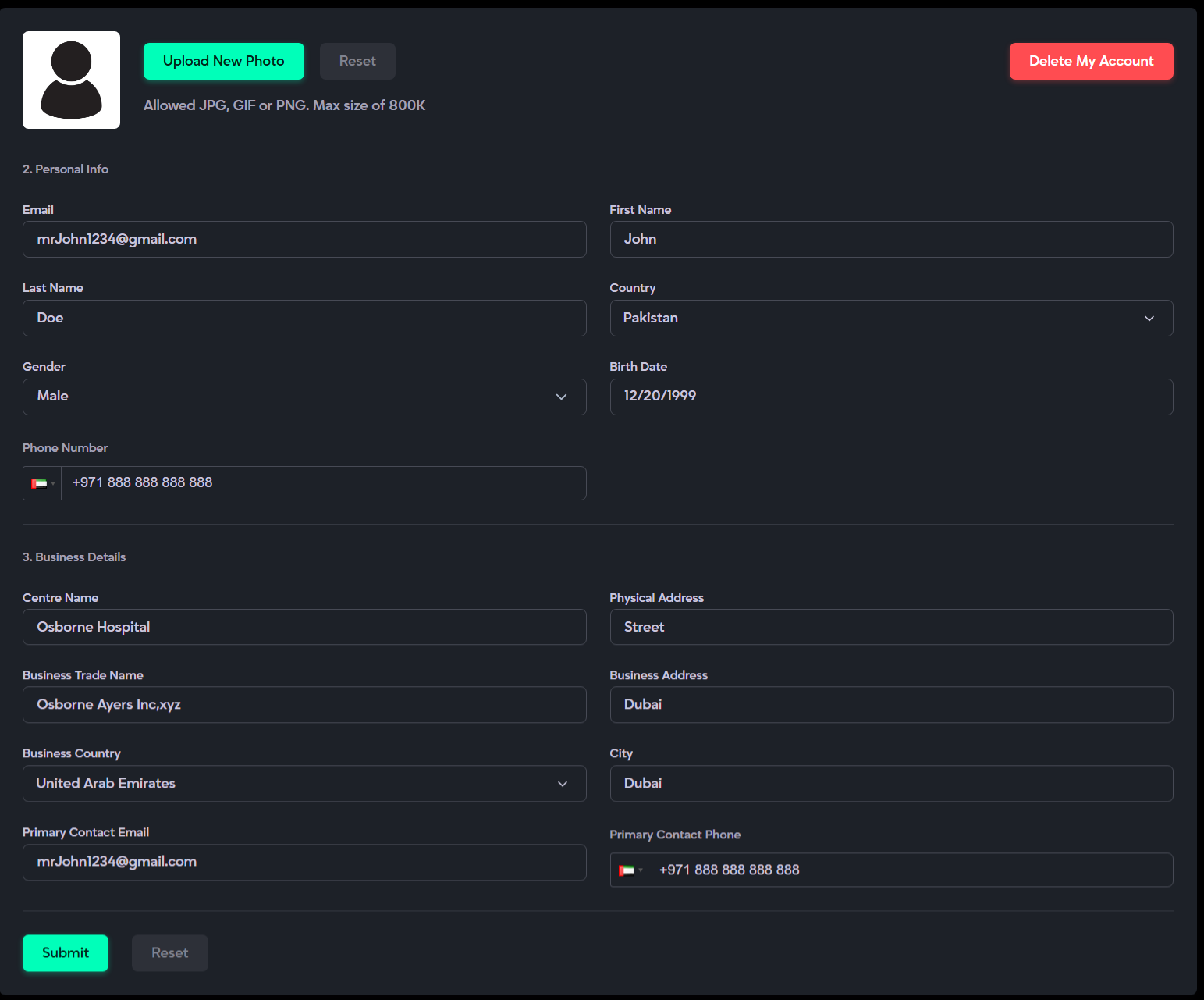 - Business Details: Update center name, physical address, business trade name, business address, business country and city, primary email, and primary contact number.