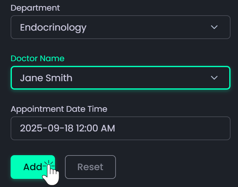 - Add Appointment → Opens a form to create a new booking by enteringpatient details, doctor information, and selecting the appointment date and time.