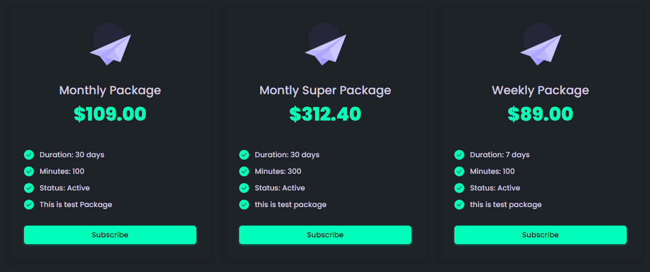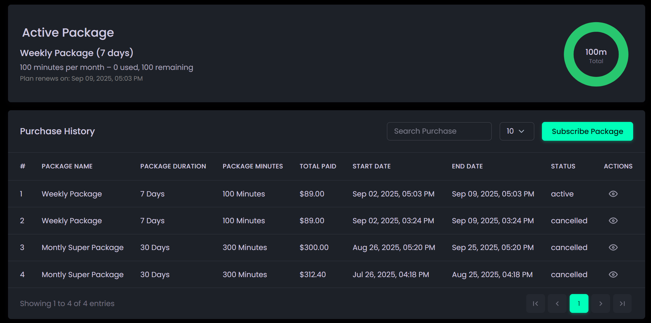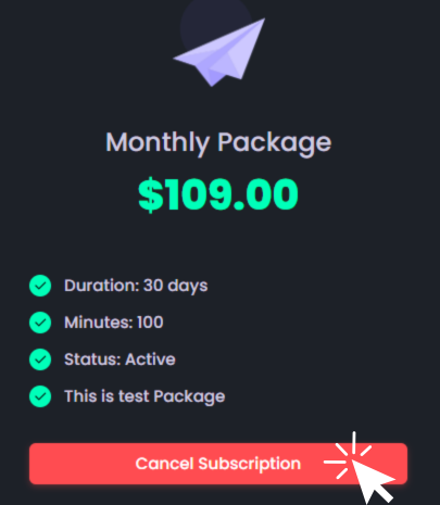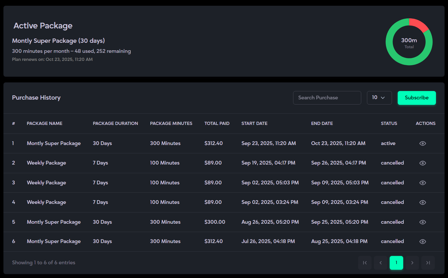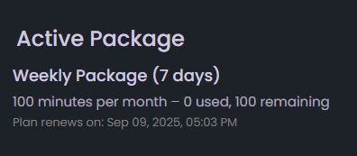 - Includes an “Add More Minutes” button that redirects to thePackages page, where you can upgrade your plan by canceling the current subscription and purchasing a new package with additional minutes.