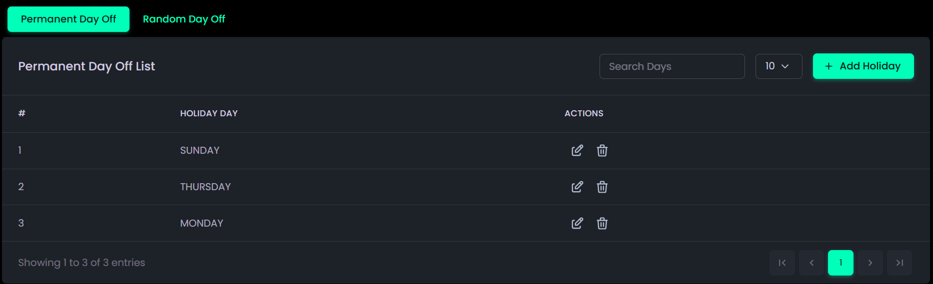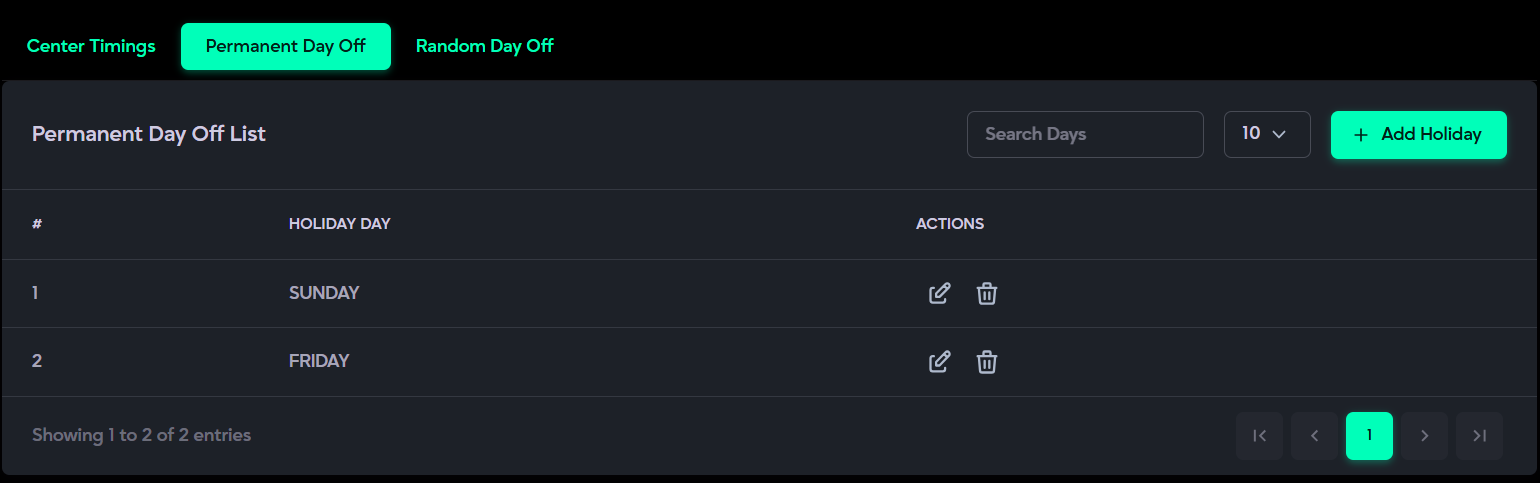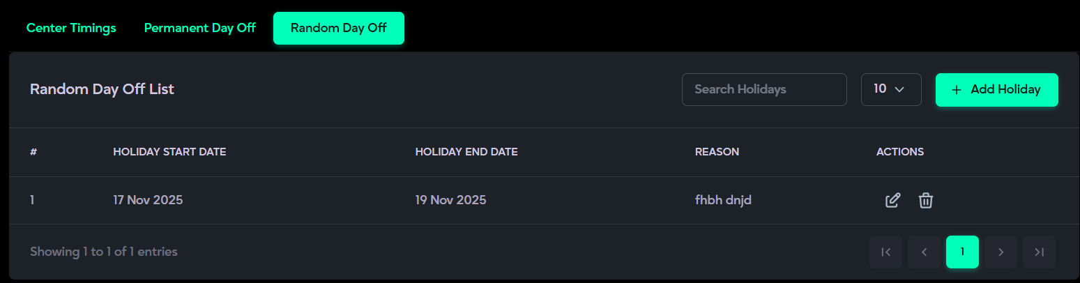 - Clinic Management: Manages clinic timings, weekly offs, and special leave days.