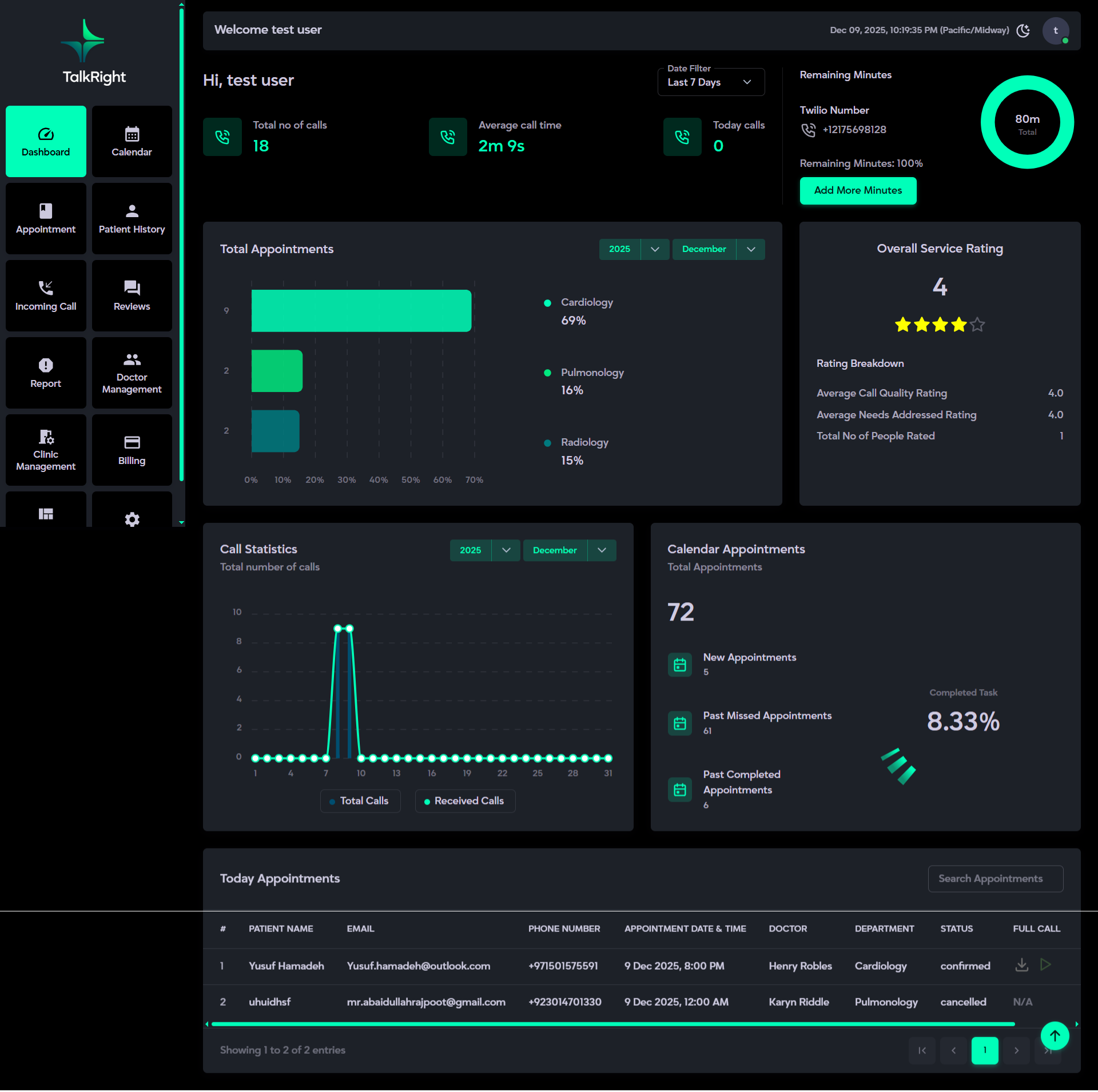 The Dashboard serves as the central control hub of your web-application, a single, organized screen that offers an overview of calls, appointments, and key performance statistics, along with quick access to detailed tools through the main menu. The following sections will guide you through each visible component, explaining its purpose and the actions you can perform. Designed for clarity and efficiency, the Dashboard ensures smooth navigation and instant access to essential information, helping you manage hospital operations effortlessly.