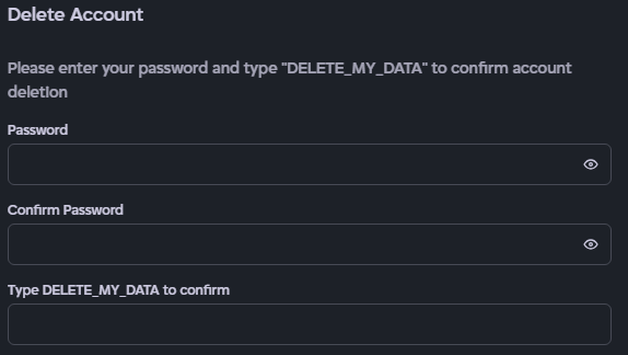 - A confirmation box will appear asking for your password,confirm password, and for you to typeDELETE_MY_DATA in all caps.