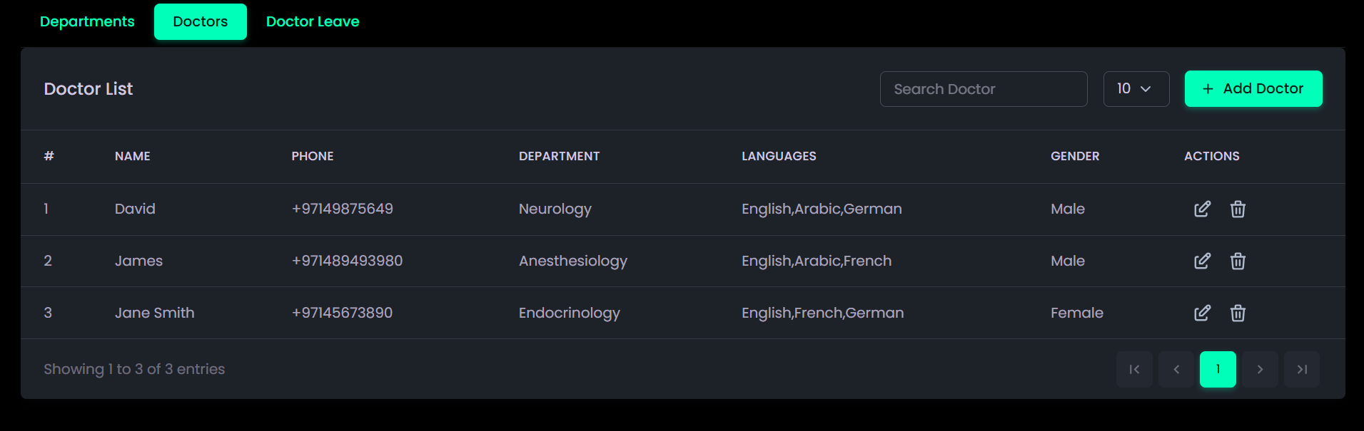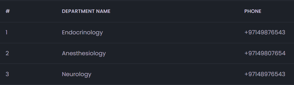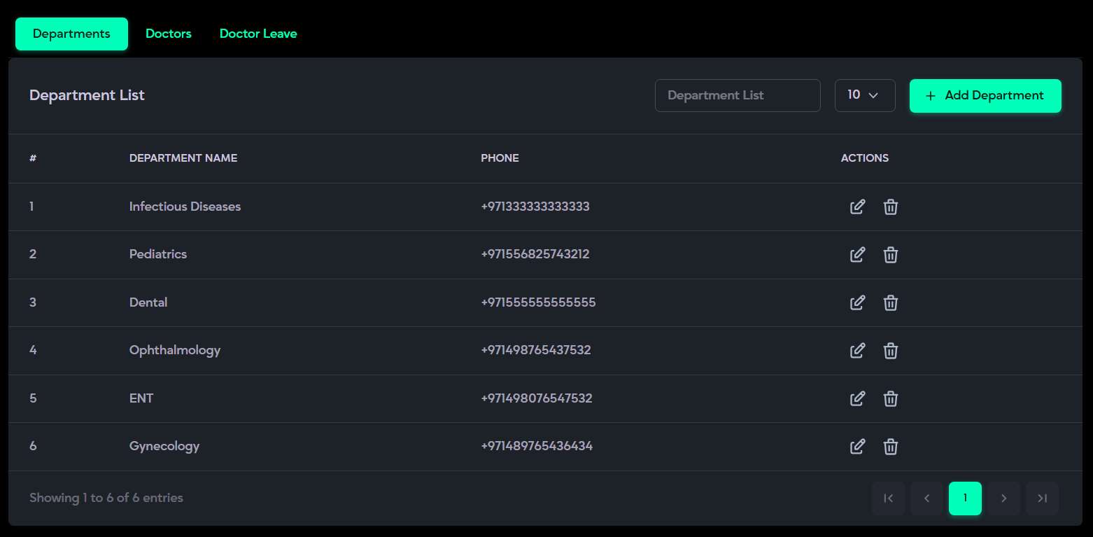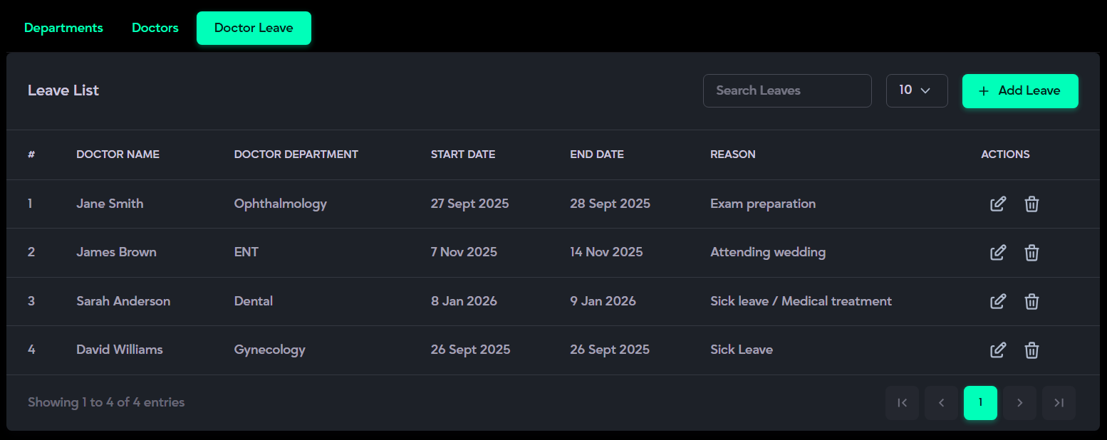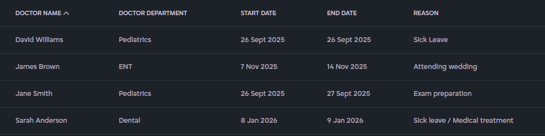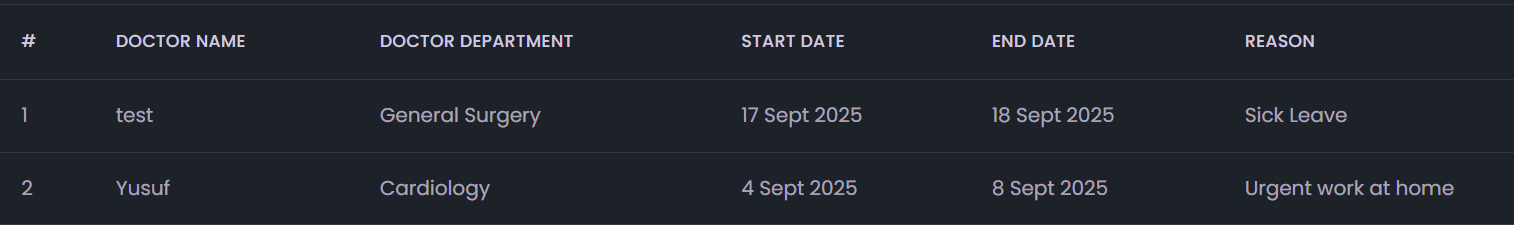 - Doctor Management: Enables management of departments and managing doctor profiles, shifts, and leave schedules.