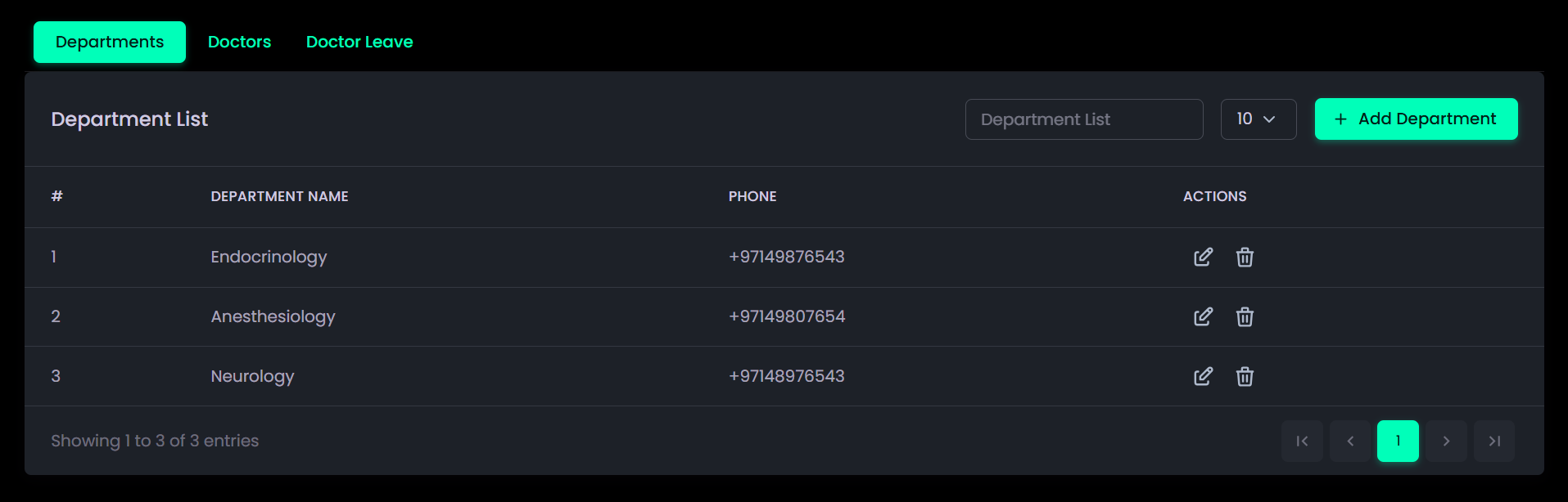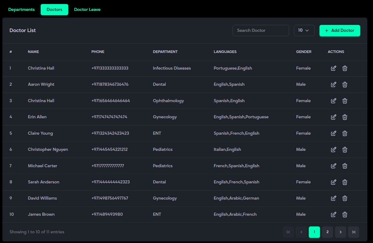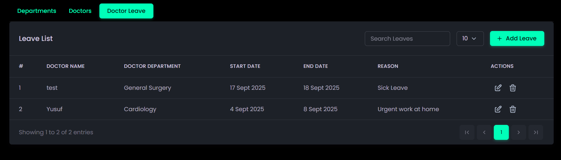 - Doctor Management: Enables management of departments and managing doctor profiles, shifts, and leave schedules.