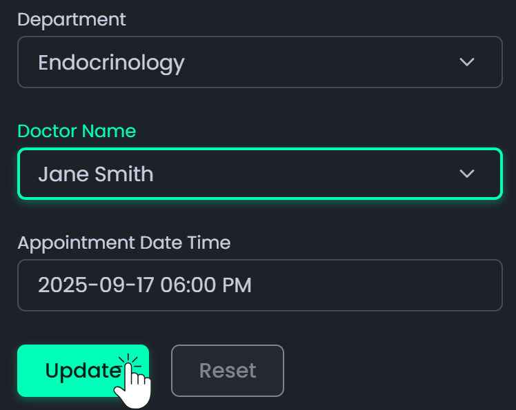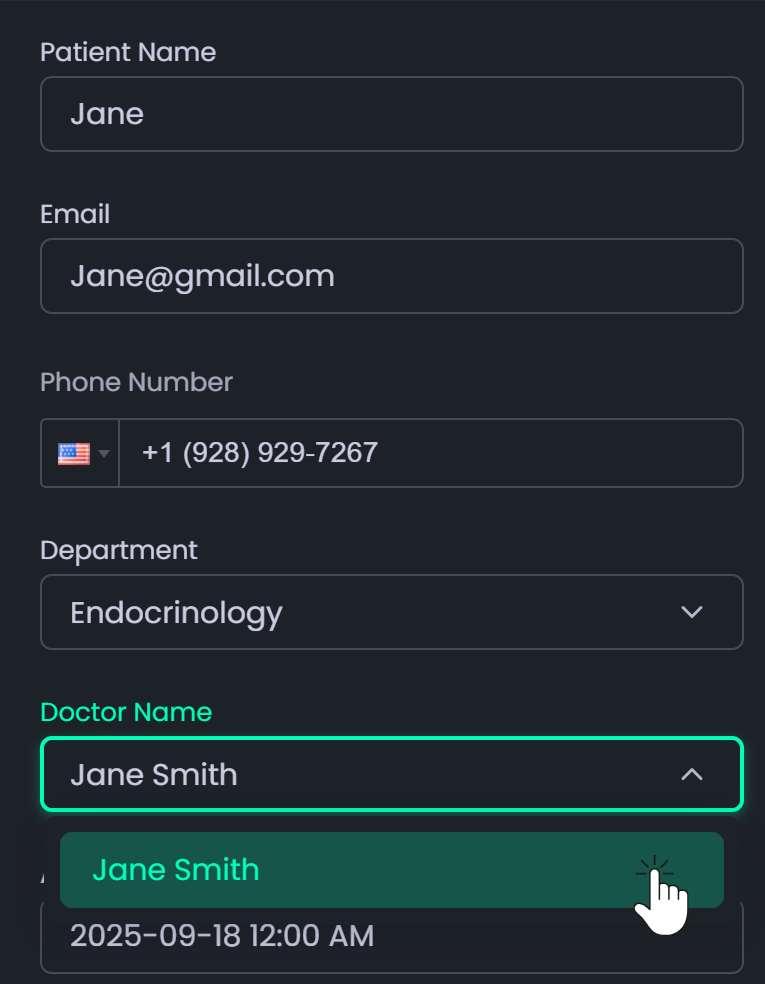 - To view booked appointments, click the patient name (displayed in the doctor’s assigned color). A form will appear showing appointment details where you can: