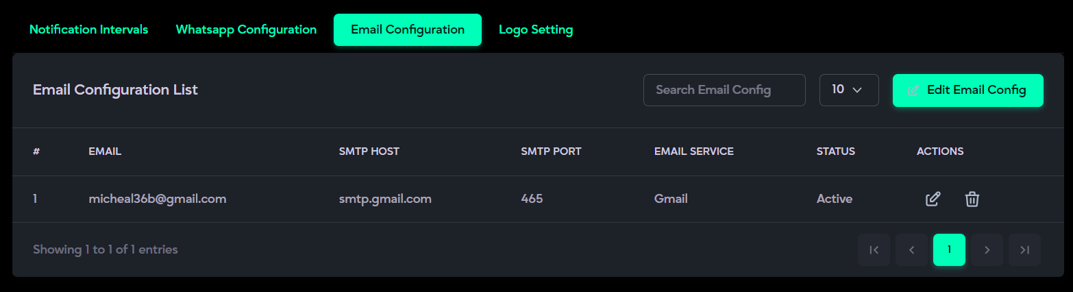 - Allows the user to add a new configuration using the Add Email Config button.