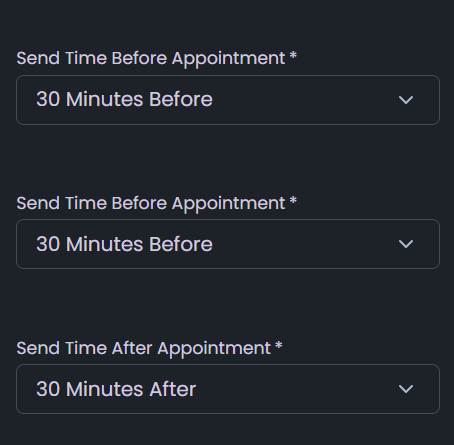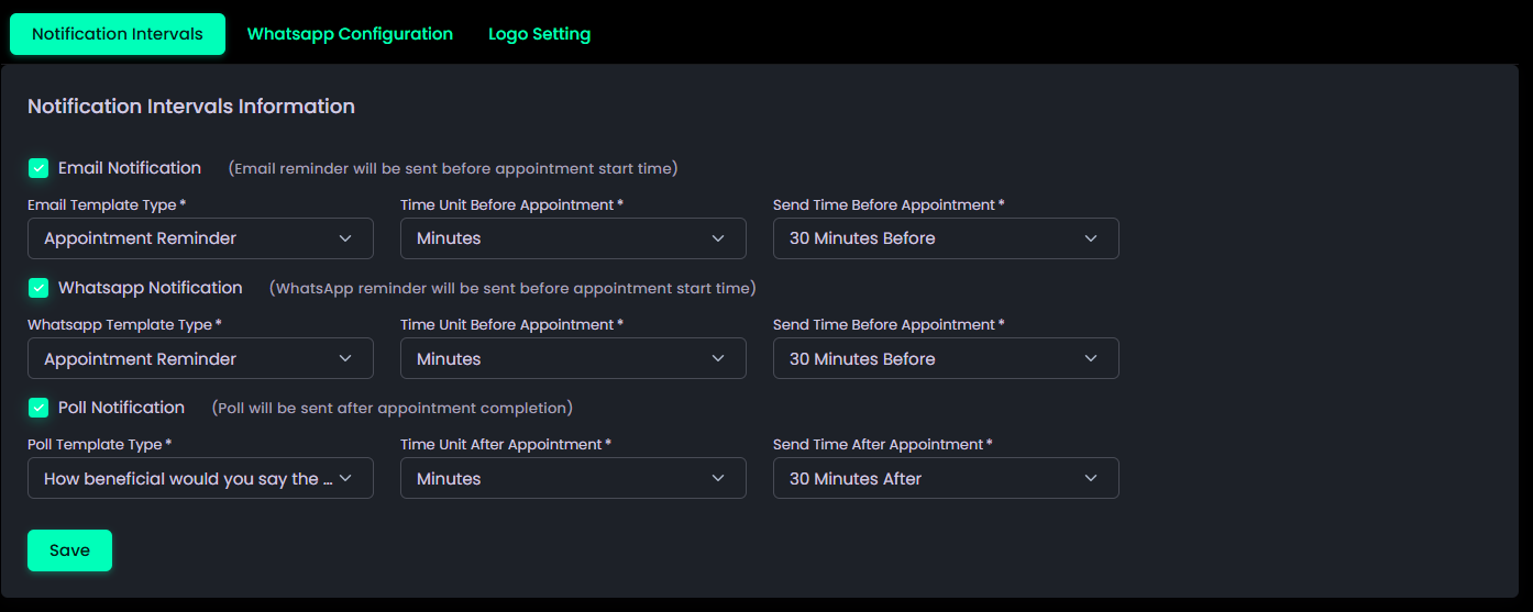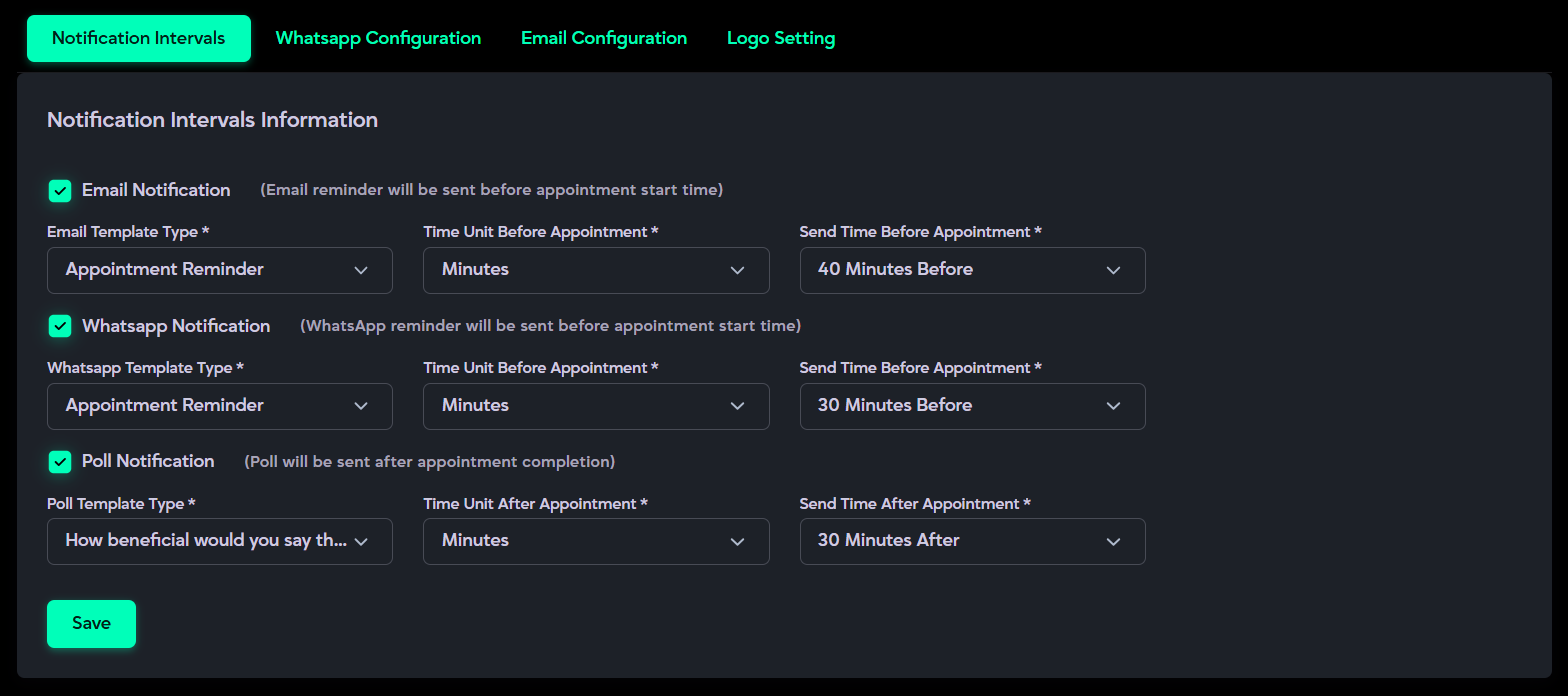 - Allows configuration of Email Notifications with ON/OFF toggle, template selection, and customizable intervals (e.g., “30 Minutes Before Appointment”).