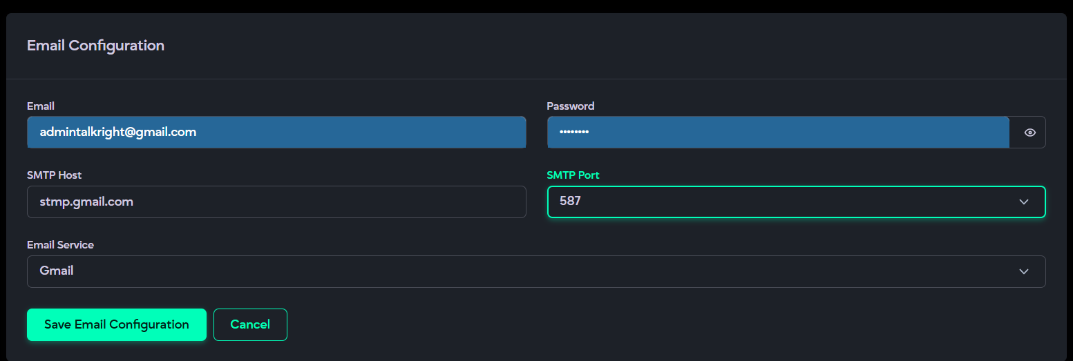 - Requires entering valid email credentials, including the email address, App Password, SMTP host, port, and email service provider.