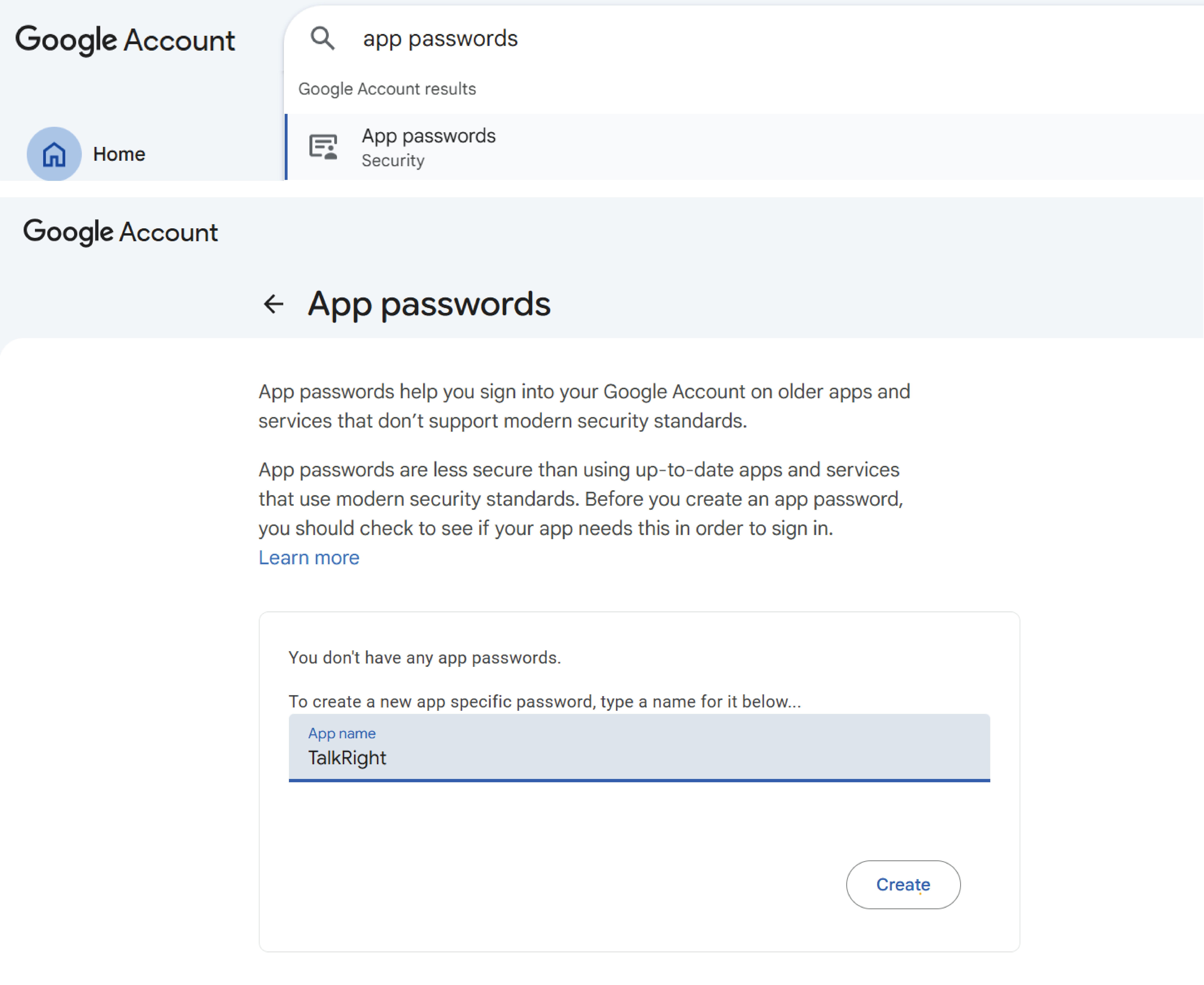 - For Gmail users, 2-Step Verification must be enabled, and an App Password must be generated from Manage Your Google Account →Security → App Passwords.