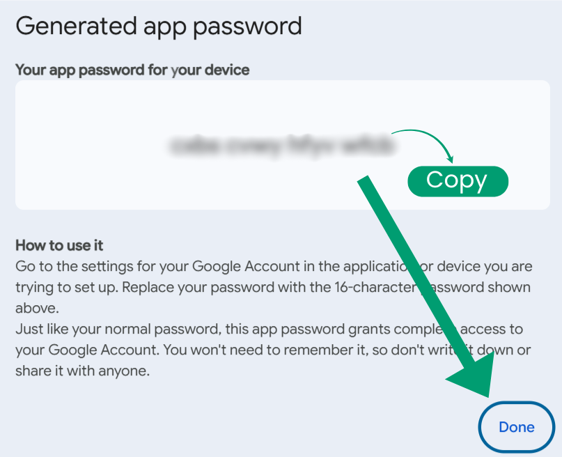 - Copy the generated App Password before confirming.