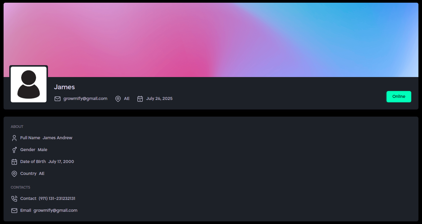 The My Profile section lets you easily view all your personal account information in one place. It helps you verify and access your profile details, including contact information, location, and platform activity.