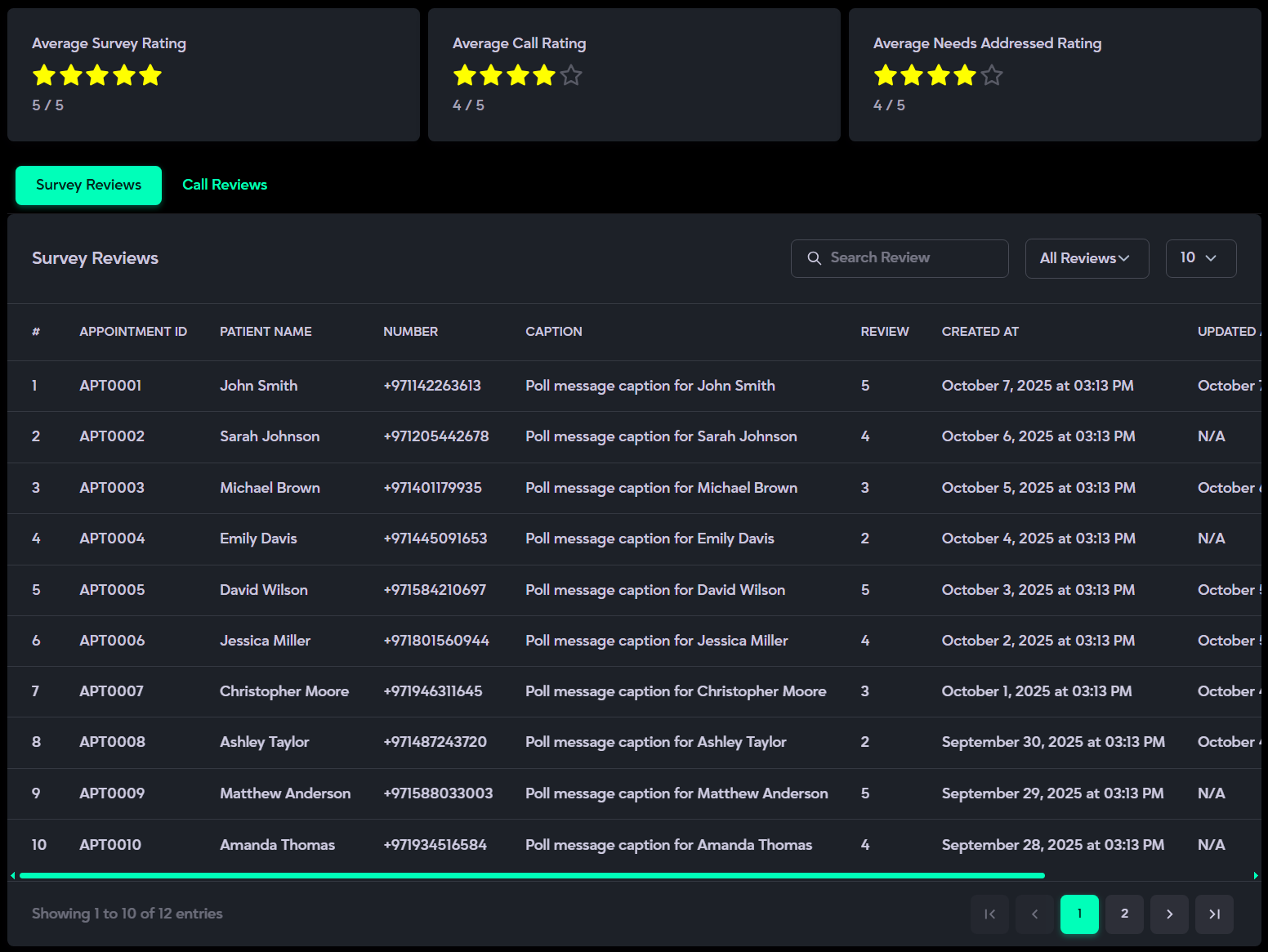 - Average Call Quality Rating – feedback from patients or callers after interacting with the AI call system (e.g., 4.5).
