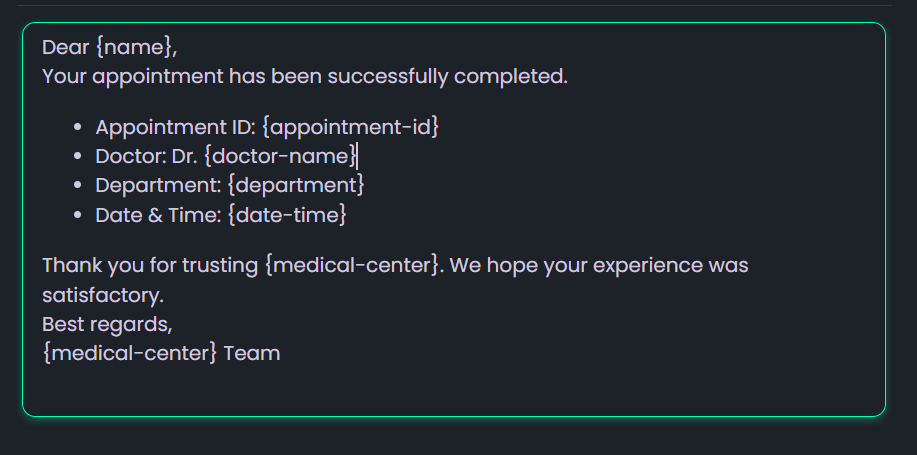 The Email Configuration section allows the system to send emails using the user’s own email address. It enables automated email communication such as appointment confirmations, reminders, follow-ups, and system notifications, ensuring reliable and personalized email delivery.