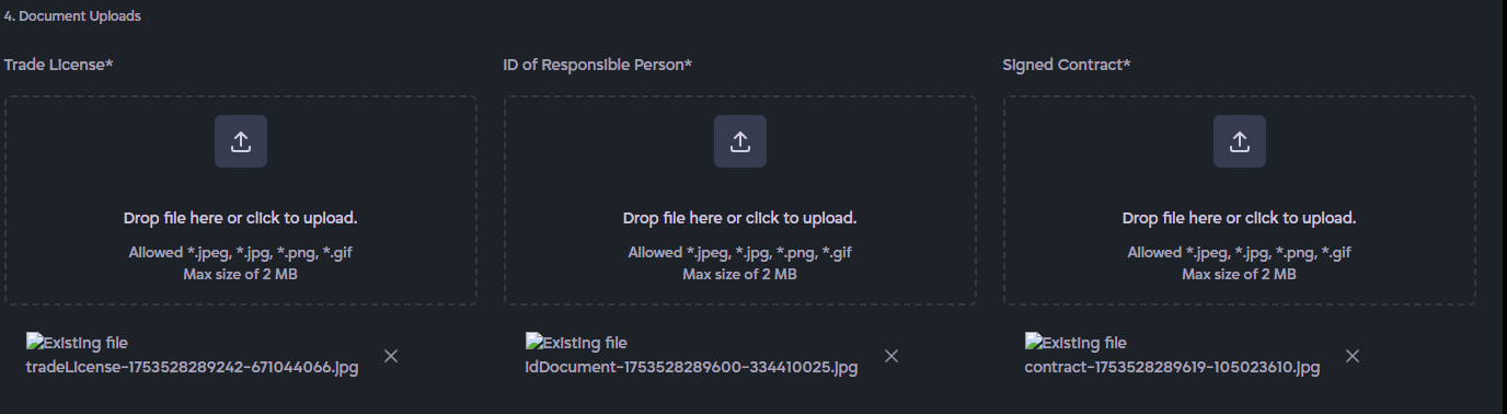 The Account Settings section allows you to view and update both your personal and business account information. It helps you manage profile details, business information, uploaded documents, and account removal in a single location.